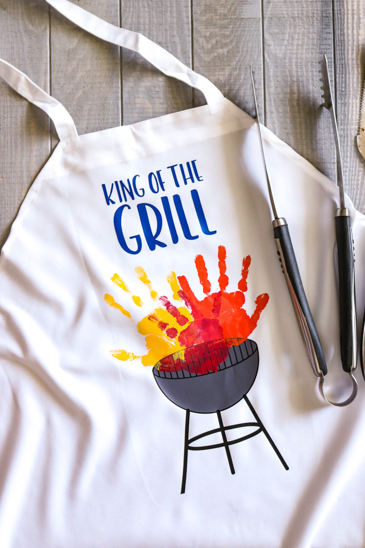 Use your electronic cutting machine such as a Cricut or Silhouette to cut out the grill and the title. Use your favorite little people's paw prints to make the "flames" on an apron and then don your Dad so you are off the hook for dinner!
